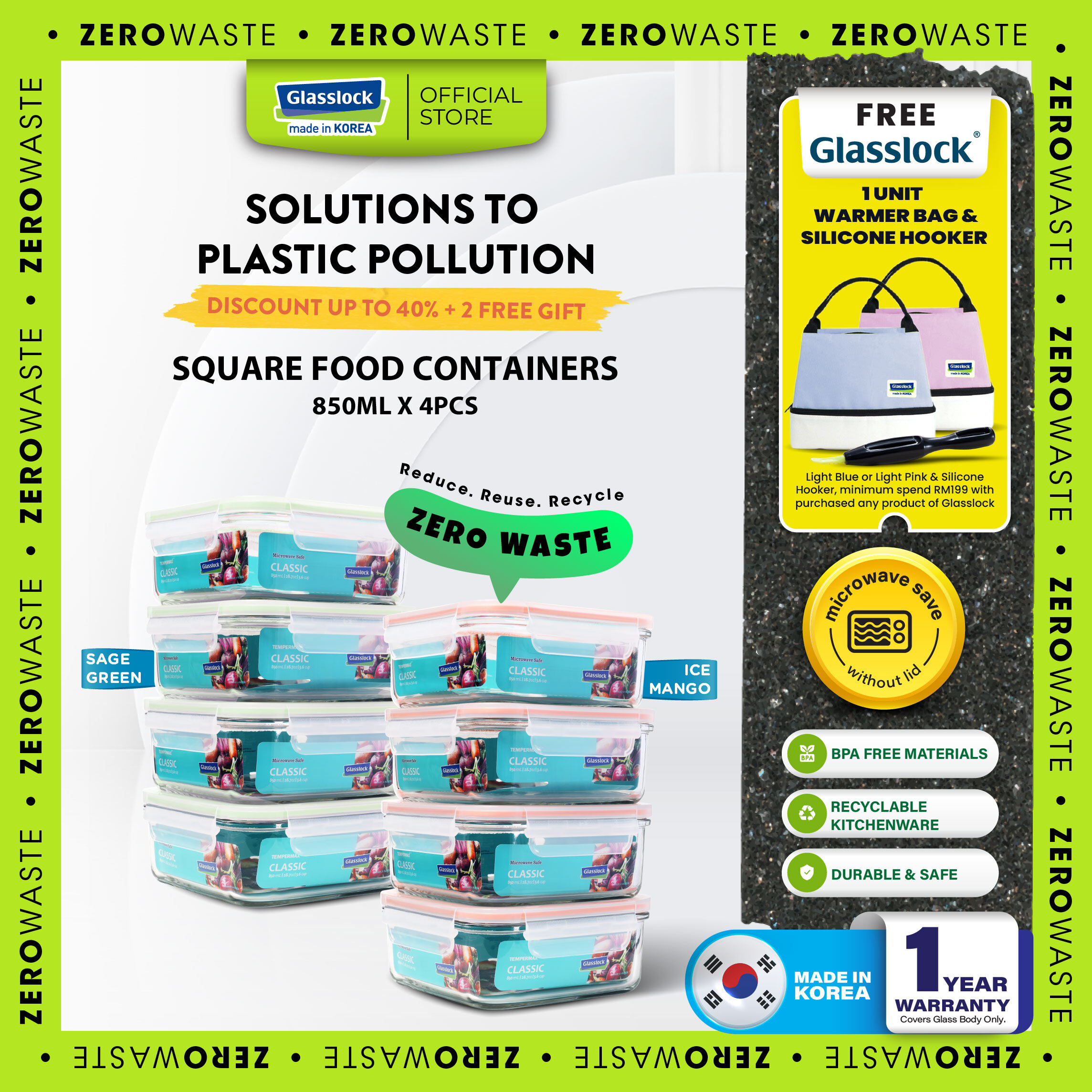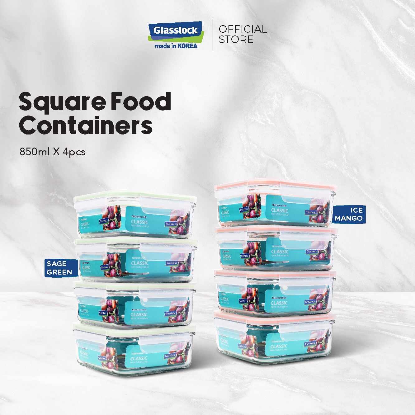 (Microwave Safe)Glasslock Airtight Food Container Square 850ml 4pcs