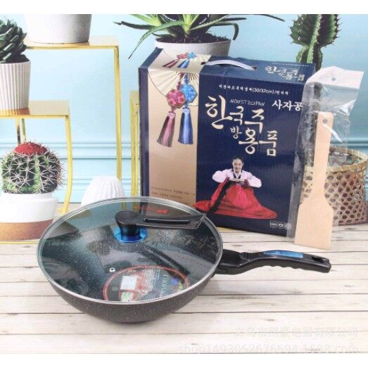 HOMEKING | Korea high Quality 32CM Non Stick Deep Frying Wok Pan with Pot Cover Kuali Viral with Lid Marble Frying Pan