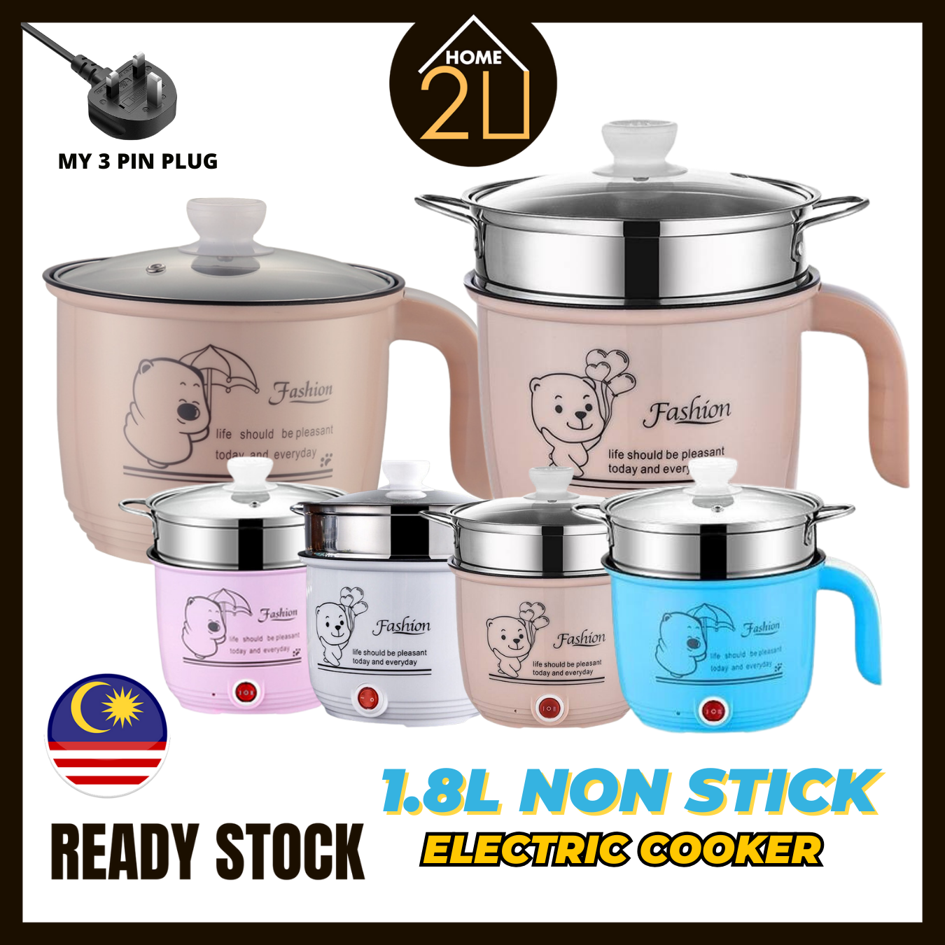 Home2U🏡 1.8L Non Stick Multi function Electric Cooker with 2 Button/Rice Cooker /Steamer Frying Pan /Portable Pot /Periuk Nasi