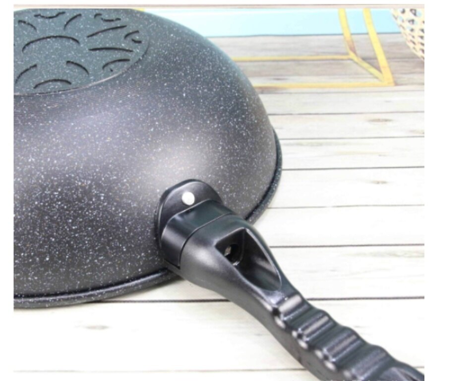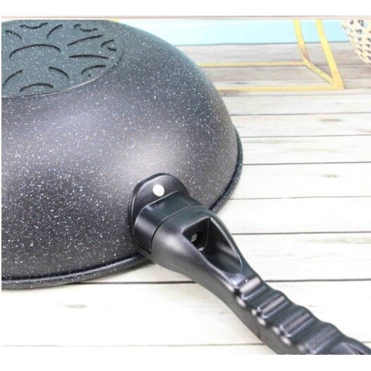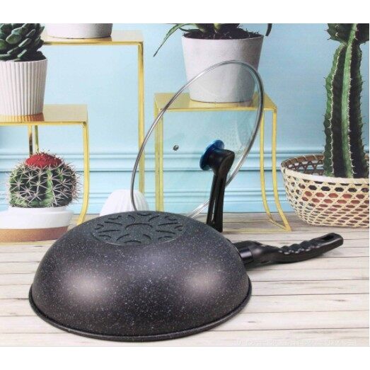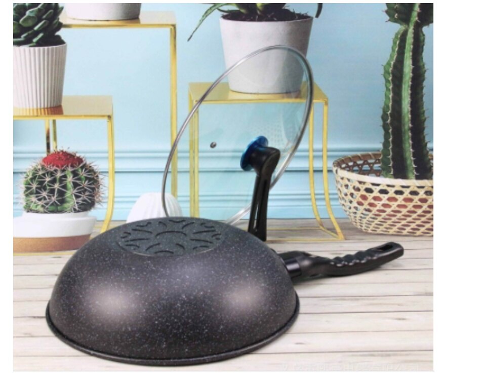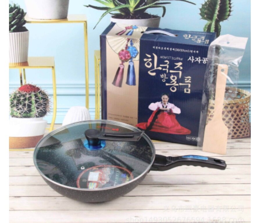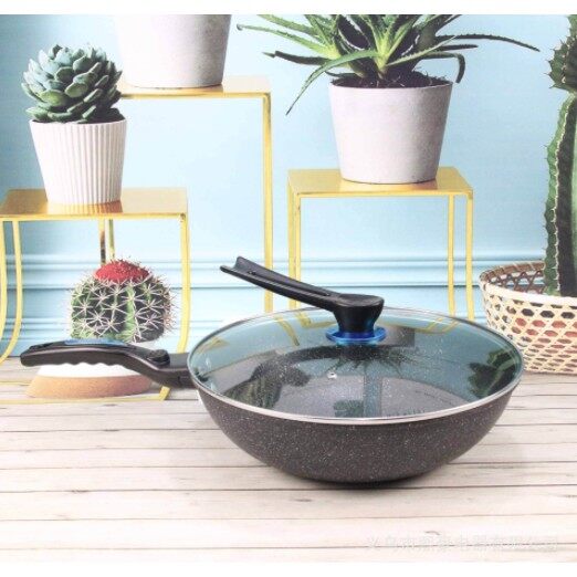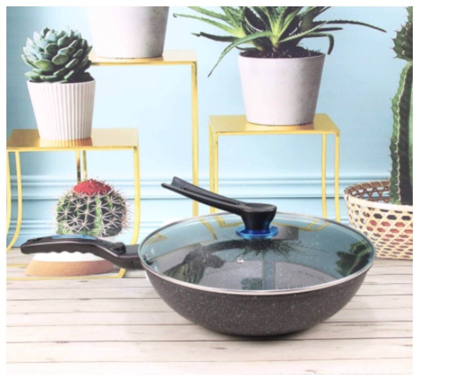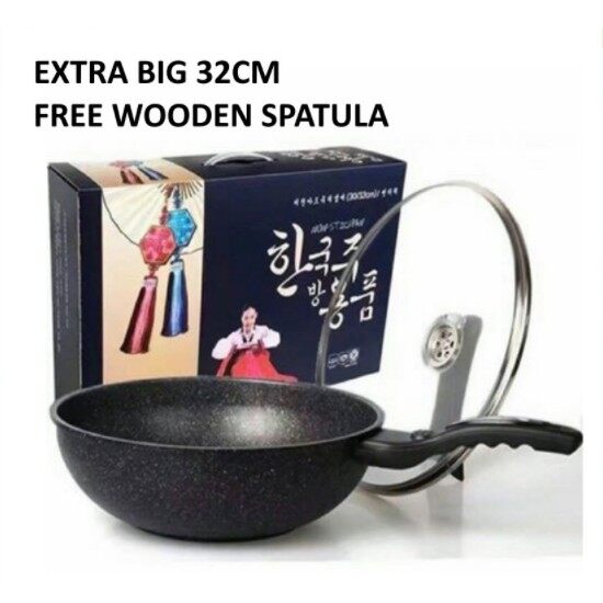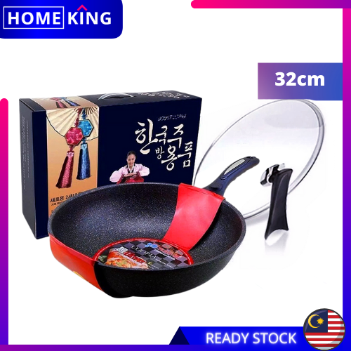 HOMEKING | Korea high Quality 32CM Non Stick Deep Frying Wok Pan with Pot Cover Kuali Viral with Lid Marble Frying Pan